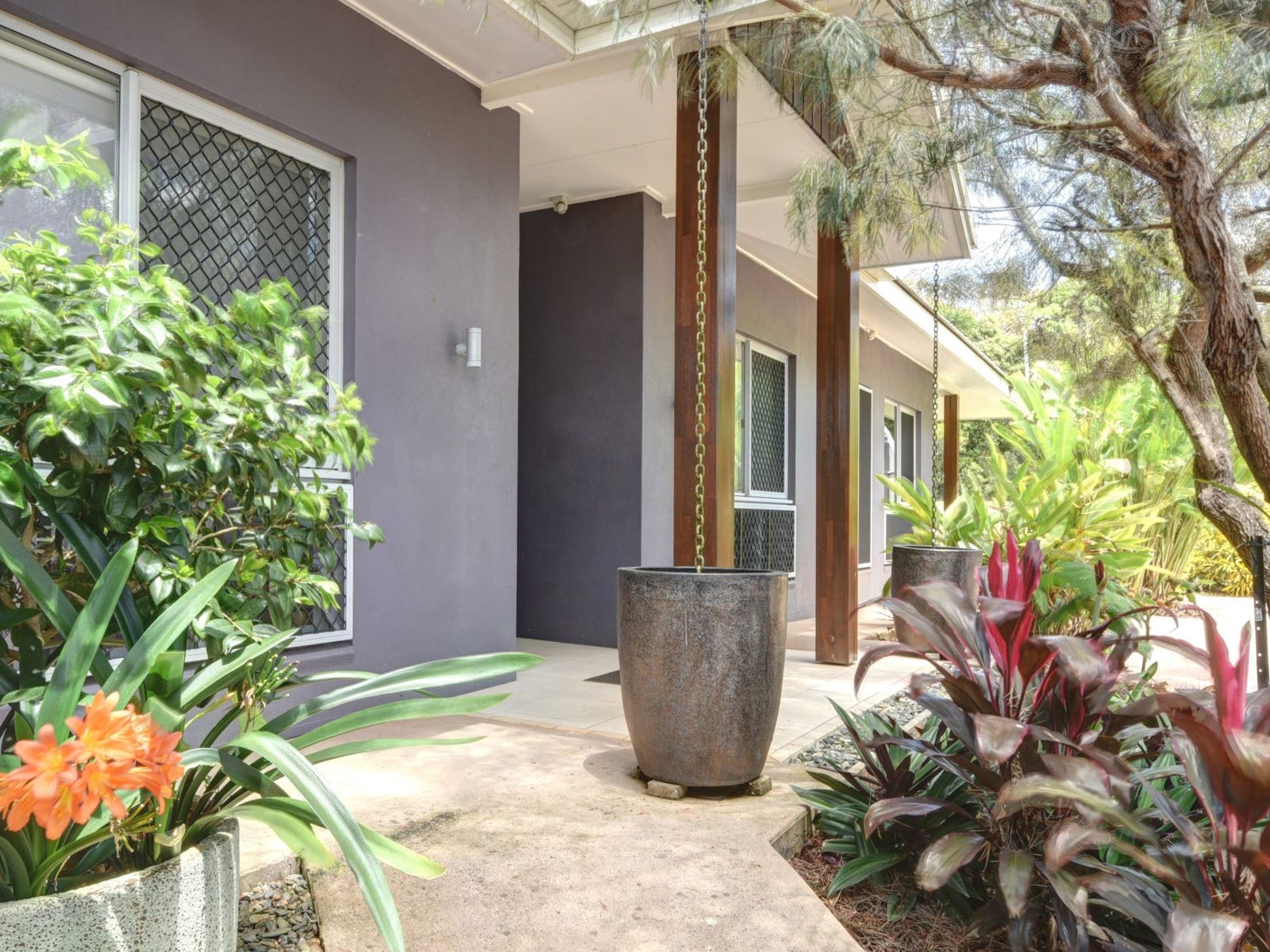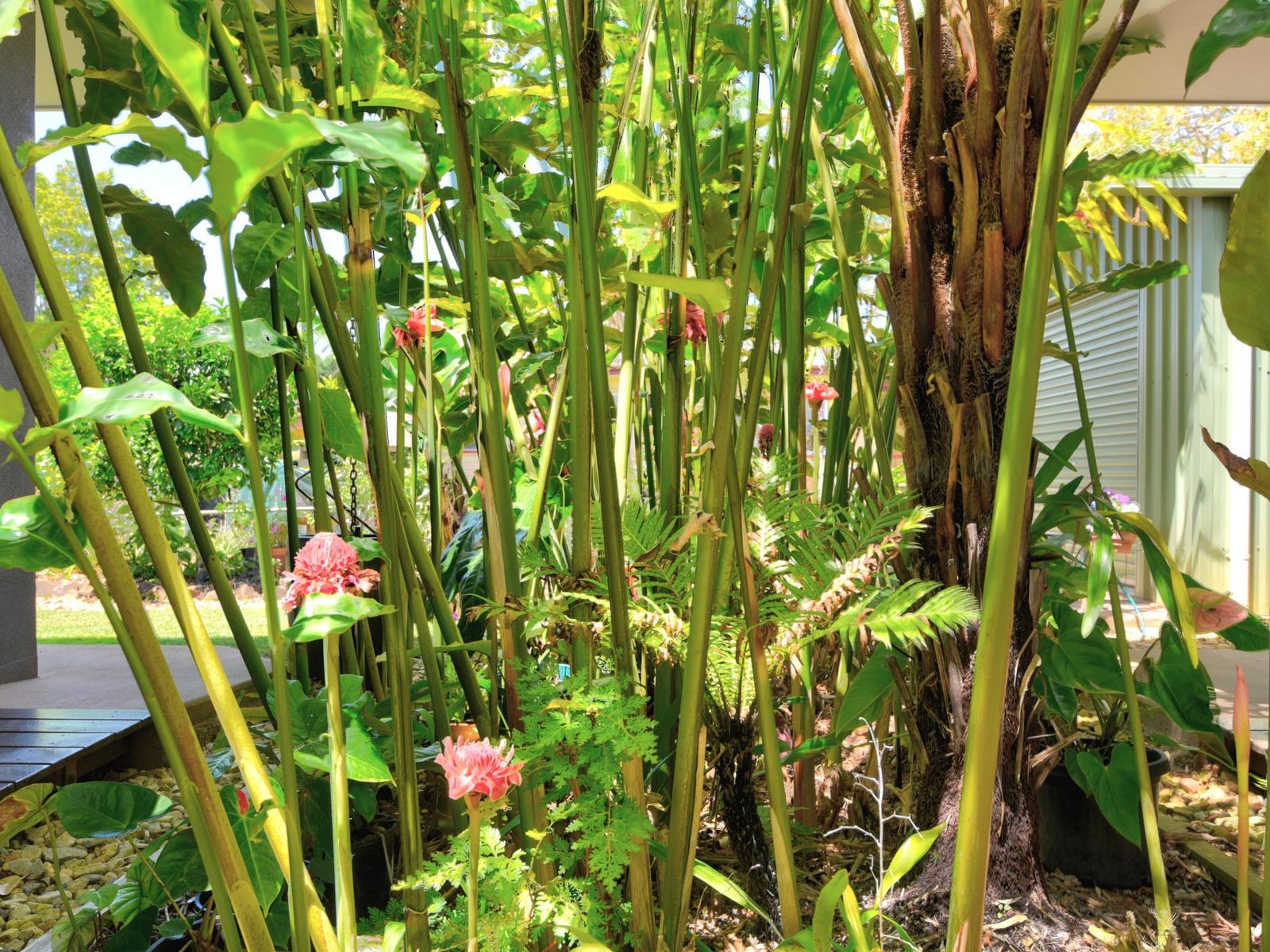 The spectacular tropical garden is professionally landscaped, includes automatic irrigation - Tropical Gingers, Heliconia, Crotons, Tree Ferns abound, plus a number of fruit trees and concrete paths all around.